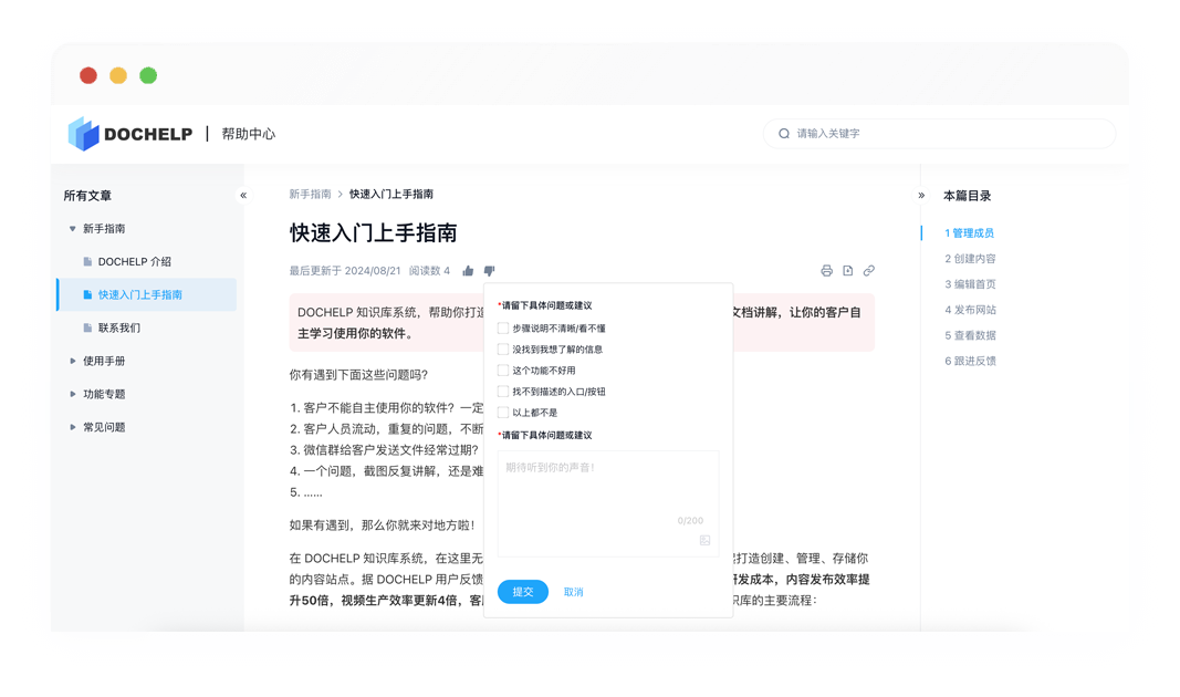 快速创建帮助中心、知识库、产品文档、API指南与FAQ站点。